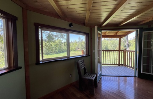 It has a full bathroom, kitchenette, sleeper sofa, a balcony, and a large sleeping loft with a queen sized bed. It is perched over a large meadow where cannabis is grown. Every window offers breathtaking views of the mountains and meadow.