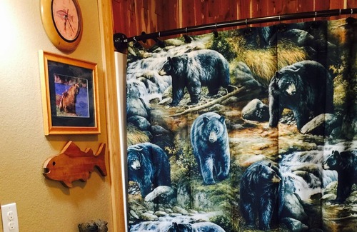 Remodeled 4 bedroom, 2.5 bathroom home with 2 living areas and stone fireplace. The hunting and fishing themed LODGE is great for your large family. First bedroom sleeps 4 with 2 heavy duty custom cedar post bunk beds. Another bedroom has a custom cedar post twin over queen bunk bed. Third bedroom has a queen bed. Master bedroom has a king bed. Each living area has new queen size sleeper sofas. There is also a twin sleeper. Large 8' custom tables will seat a crowd for dinners, crafts or game time. Fully equipped kitchen includes microwave, crock pot, coffee maker, pots, pans and all the dishes needed for your large family. Washer and dryer (bring laundry soap and dryer sheets.) Charcoal grill and picnic table provided. Full amenities of Horseshoe INN and Campground, including pool, volleyball, horseshoes and lake access. PRIVATE 30” round POOL.