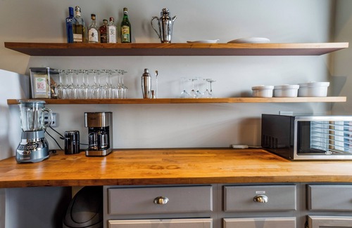 The street-level main entrance opens to a flight of stairs leading up to the Loft. The full kitchen is large and has windows offering views of the rear parking area and adjacent streets and buildings.The kitchen is fully stocked with cookware, dinnerware for 4, a full-size dishwasher, and a coffee maker. The dining area has a large table that comfortably seats 4 and is a fantastic spot for a sit-down dinner or game night.