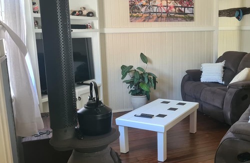 10mins from pristine beaches of Yamba, 200m from the Clarence River & kids park. Beautifully renovated late 1800’s weatherboard home has retro characteristics which possess a queen, two doubles and three single beds plenty of storage, two TVs an open plan living room that flows to the entertaining area with a gally style kitchen with stone bench tops that's stocked for the home chef, and a stylish bathroom, there's a exercise bike and office nook and river walking access and a shared backyard.
