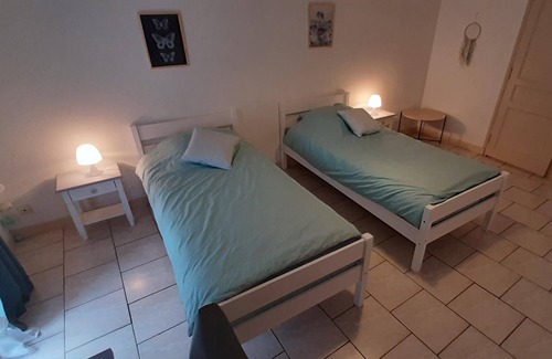 Semi-detached house on 200 m² land with terrace. Ground floor: large living room (wood stove-1st basket offered), living room (TV), fitted kitchen (microwave, freezer). Bathroom (shower and bath). WC. Floor: relaxation area (children's games). 1 bedroom (1 double bed, cot), 1 bedroom (1 double bed), 1 bedroom (2 single bed). Beds made. Electric heating. Cleaning option 50 euros. Garage for 1 small car. 1 animal accepted. Possibility of donkey or horse-drawn carriage rides on site. Castle and museum of the school of yesterday at l'Echelle 4 km, Signy l'Abbaye park accrobranches and Marlemont (equestrian center) 7 km, Liart (educational farm) 10 km, Rocroi (fortified town and Lac des Vieilles Forges) 15 km. Charleville-Mézières (museums, aquatic center) 25 km.