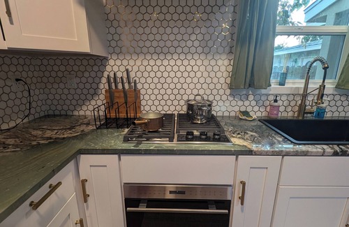 Newly remodeled in Summer of 2024 we've placed touches of luxury throughout: Brazilian marble countertops, open floor plan with panoramic patio doors and cedar vaulted ceilings this space is peaceful and less than 15 minutes from SDSU, Kaiser Permanente Zion Medical Center, SeaWorld, the beach and multiple military bases. We love our privacy and have curated an experience that caters to your need for peace, quiet and a home away from home. Your private yard is lushly landscaped with multiple trees, passion fruit, and an emphasis on privacy. Perfect for relaxing after a long day. Totaling 1000 square feet of enclosed living area and 5000 square feet of manicured grounds, the property is open, roomy, and vibrant. Please note there are 2 cameras on the public areas of the property. One at the front door and one facing the garage. This is in accordance with our insurance requirements and while they are active, they are not actively monitored. Bring your furry friends and stay a while!