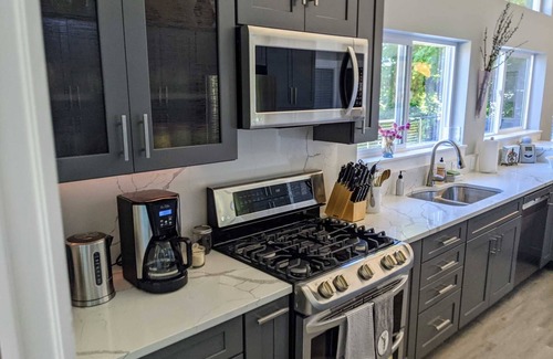 The kitchen is well equipped with the latest technology appliances. Gas oven & stove, center island for easy meal preparation and separate sitting bar for bistro seating. The dining area is next in the flow of this great house and "great room" with a dining table seating 6. Living area has a great large couch to sit back and enjoy the large 60" TV with Amazon Fire stick. Music available via Alexa with Echo Dot speakers. Propane Fireplace to set the stage.