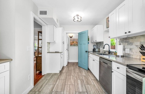 Upon entering the main house, you are welcomed by a beautifully furnished living room and dining room. Original pine hardwood floors run throughout this spacious home which is full of natural light. The primary bedroom in the main house features a queen bed, large his & her California Closets, and a dresser, which provide ample space and storage. The 2nd bedroom is furnished with 2 twin beds and a large chest of drawers. The home office has all the essentials you’ll need to stay connected while you’re away. The kitchen comes fully equipped with pots, pans, plates, and serving utensils. The laundry room provides the convenience of a new washer/dryer, iron, ironing board, and fresh linens.