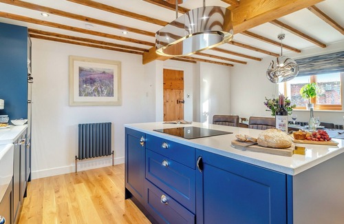 Shower Room: Cubicle Shower, Heated Towel Rail, Toilet. Oil central heating, electricity, bed linen, towels, Wi-Fi and fuel for wood burner included. Welcome pack and doggy extras. Enclosed lawned rear garden with patio, garden furniture and BBQ. Hot tub for 6 (private). Private parking for 4 cars. No smoking.. A stunning, semi-detached barn conversion with its own private hot tub and large, enclosed, wrap-around, lawned garden. Perfect for family holidays, it has has been completely renovated into a stunning holiday home, ticking all the right boxes. It offers contemporary, luxury accommodation which blends original features enabling it to maintain its charm and character. The spaciousness offered means that you can choose to spend quality time with your loved ones, or break away to enjoy your own pursuits in a separate area. Impeccable detail is on show throughout the home, which includes a sociable, open plan kitchen/dining room. The living room has large comfy sofas where you can enjoy quality time in good conversation or enjoy a film together. The feature wood burner is perfect to snuggle up in front of during the cooler evenings. On the first floor are three bedrooms - a kingsize bedroom with an en-suite shower, a spacious four-poster kingsize master bedroom with Smart TV and en-suite shower, and a further twin room. There are two further shower rooms, one on first floor and another on ground floor.