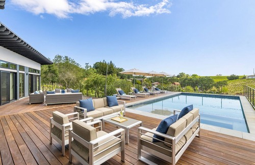 Brand new modern luxury home designed to maximize the natural beauty & surrounding calm. Perched on a hill surrounded by 100 year old oak trees, this spectacular home was built facing beautiful rolling hills and vineyards with ultimate guest comfort in mind. Enjoy your AM coffee watching a family of quails roaming the vineyard and end your evening with a glass of wine on the deck watching the sun set behind the golden vineyard hills. Located approx 3.5 miles (6min) from the Healdsburg Plaza