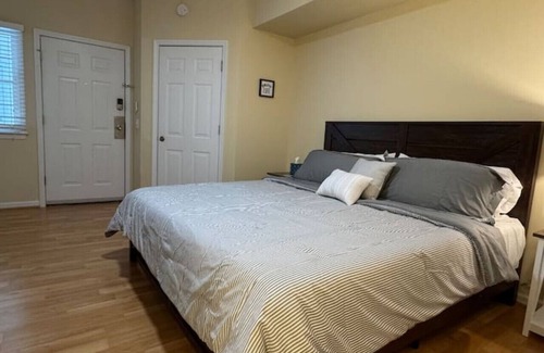 We offer a hotel-style suite with one king bed, microwave, refrigerator, & coffee maker. This unit has one full bathroom.