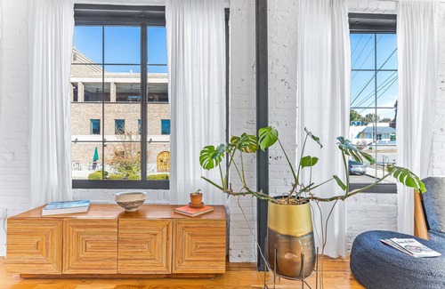 The Sapphire has a private entrance via smartlock; it features high ceilings, expansive windows and a thoughtfully curated design. The loft offers an unbeatable location, premium bedding, fully stocked modern Italian kitchen and appliances, artwork from the owner's world travels, & complimentary morning coffee from our family's coffee/wine bar downstairs.