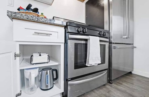 Stove | Oven | Refrigerator | Microwave | Toaster | Water Kettle | Brita Water Filter | Cooking utensils | Silverware | Coffee maker | Oven mitts | Mugs, cups, and wine glasses | Dining table