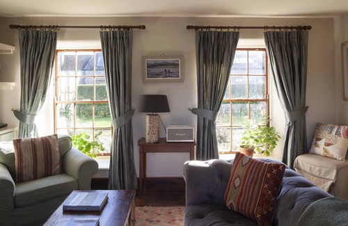The house is fully kitted-out and comes serviced and ready to go. It’s suitable for up to 6 people staying in three bedrooms. There are two large bathrooms with double ended baths, a separate large rain shower, as well as a separate downstairs cloakroom. There is a stylish kitchen with an Aga, old glass-fronted cabintes, thick wooden counters and everything you need to get cooking, you can even order fresh produce from the gardens. With a high-ceilinged dining room (once the mare’s stable) and a super comfy sitting room, the house is spacious and lightfilled.