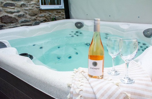 Private enclosed garden with 6' fencing, patio seating, charcoal BBQ, and hot tub. Two private parking spaces (additional spaces available by arrangement). Access to the cottage is via the back garden and sliding patio doors.