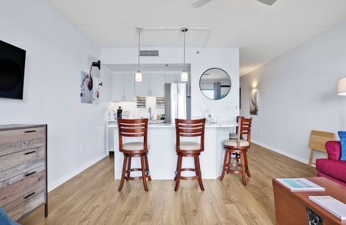 The fully remodeled kitchen is a dream to cook in, with a sleek induction cooktop and a wraparound counter that seats four — perfect for morning coffee or a laid-back dinner with a view. The open-concept design flows straight toward floor-to-ceiling sliding doors that lead to your private balcony, where the sunsets paint the sky over the USS North Carolina every evening.
