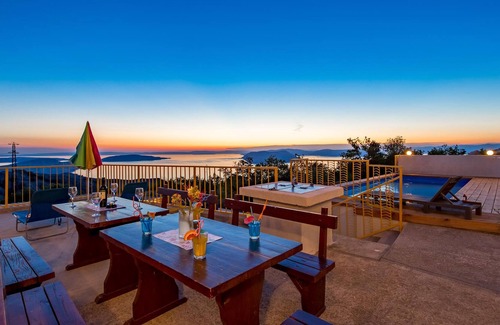 This beautiful vacation home with a private pool will offer you unforgettable moments. Enjoy the magnificent view of the sea, which you can enjoy from the terrace and the pool. The house consists of two floors connected by outdoor stairs. Relax in the shade on the large and covered terrace. At your disposal is also a summer kitchen with barbecue, so you can cook here in the fresh air. After swimming and sunbathing you can entertain yourself with billiards and darts. For the little ones there is a play corner.