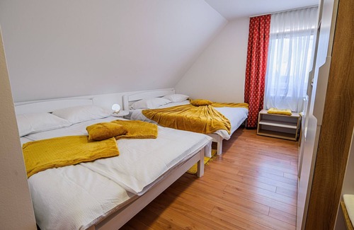 The Three Bedroom Apartment has a cosy atmosphere and is furnished to be spacious yet offering great utility for up to 10 guests. It is located on the upper floor of the building with a private entrance. The apartment itself is divided into two floors with the lower consisting of the well equipped kitchen which has a stove, extractor, oven, microwave, water kettle, kitchen utensils, refrigerator with freezer and all nesecciities provided to make great meals. Adjacent to it is the lovely dining area with a large table and chairs to enjoy the prepared cooking. Moving from the dining room a comfortable living room avaits where guests can sit back and relax. A bedroom with double bed and a bunk bed is accessed from the living room.