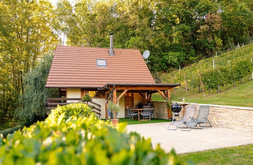 Surrounded by lush greenery and vineyard-covered hills, this charming accommodation offers ample outdoor space for relaxation. A roofed terrace with a table, chairs, BBQ grill, and loungers invites guests to enjoy picnics or outdoor gatherings.