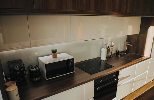 Our apartment provides you with anything you need in order to have a full-home experience. From drinking a cup of foamy-coffee in the morning with your friends on a very spacious balcony, cooking in a fully equipped kitchen, dining in a gorgeous and spacious dining-area to watching a Netflix movie on a 4K TV while eating nachos and popcorn or enjoying a hot bath in a luxury bathtube from the master bedroom.