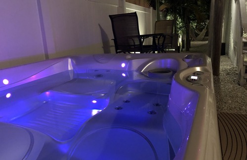 The Englewood Beach apartment is a 1st floor king bed unit with direct access to the garden and the Tiki BBQ area . It has a second bedroom with a bunk bed. A private backyard area including an exclusive right of use of the Hotspring Hot Tub. Decide how warm you would like to have it!