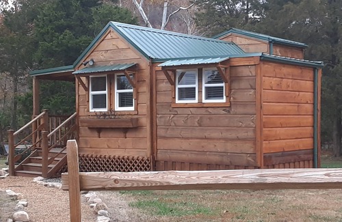 The new tiny cabin is 250 sq ft with unique sleeping loft with full size bed accessed by ladder. On the main level full bathroom, fully stocked kitchen, and bunk beds if you prefer. Large front porch overlooking river, fire pit, and outside eating area.