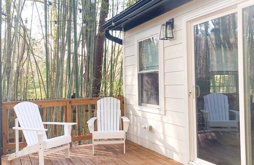 Enjoy our BRAND NEW Tiny House! Just under 400 sqft and nestled in a peaceful bamboo forest. This home has everything you could need. Fully stocked kitchen with granite countertops. Dining table. Sleeper sofa- perfect for relaxing and watching movies on our 42” Roku T.V. Built in desk and high speed wifi. Queen sized bed. Bathroom with tub and shower. Huge back deck- perfect for relaxing with a book. Washing machine/Dryer combo.