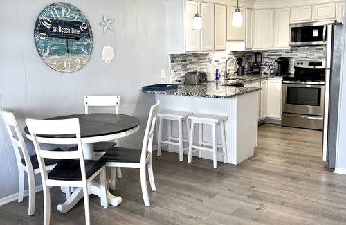 Welcome to our beautifully renovated ocean block condo! We have updated our home with everything you should expect on your vacation. This unit has been completely rehabbed with a new kitchen w/granite counters, S/S appliances, a full size fridge with ice maker, built in microwave, electric stove/oven, and a full size washer/dryer. Including new luxury vinyl plank flooring, porcelain tile shower, furniture, mattresses with memory foam, and Poly deck furniture.