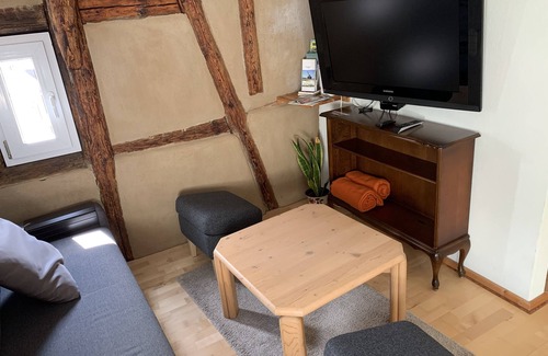 Our 50 m² apartment / attic studio is located in the middle of the old town of Rüdesheim am Rhein. Kitchen with kitchenette, living / dining area with sofa bed and flat screen TV, bedroom with double bed attic studio, daylight bathroom, wifi. Nichraucherwohnung, cot / high chair, towels and bed linen are provided for you.
