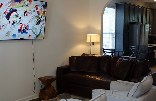 The home boasts an open-concept living area, a fully equipped kitchen, and private bedrooms each with their own en suite bathroom, providing privacy for all guests. The townhouse is pet-friendly, making it ideal for families traveling with their furry companions.