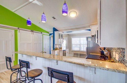 The vaulted ceilings and open plan of the living room-kitchen-dining room offer plenty of seating and eating options. A wall of windows provides ocean views from every point in this room - watching TV on the couch, pouring a glass of wine at the bar, or even washing dishes!