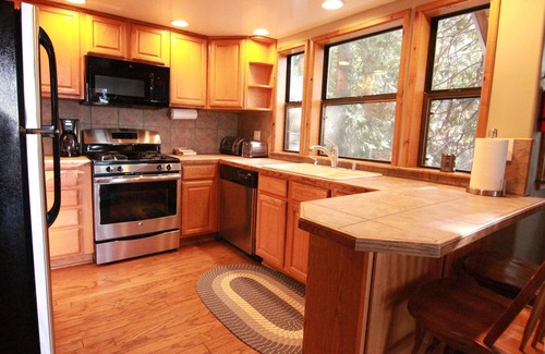 Well appointed with the feeling of home in a quiet setting, this cabin has two bedrooms and a loft that sleeps 8 comfortably. The master bedroom has one king bed, the second bedroom has one queen bed and one single bunk bed, and the loft has two full and one twin bed. Satellite WiFi is free (the wifi speed in unreliable for video streaming and video calling). Enjoy your fully equipped, newly remodeled kitchen with the close by deck, BBQ and chairs. Beat the crowds in this cozy cabin in the trees!