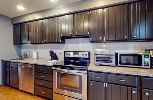 In the evenings, kick back on the sofa and stream your favorite movies on the living room's smart TV, or retreat to one of the two desks (in the dining room and the basement) to log onto the high-speed WiFi. Additional features of the house include TVs in the bedrooms, a private washer/dryer, and split AC throughout.