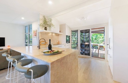 You will find all you need to prepare a feast in the kitchen, whether sharing meals at the breakfast bar, around the eight-seater dining table, or dining alfresco on the generous deck. There's a six-seater table overlooking the lush treetops and semi-shaded pool.