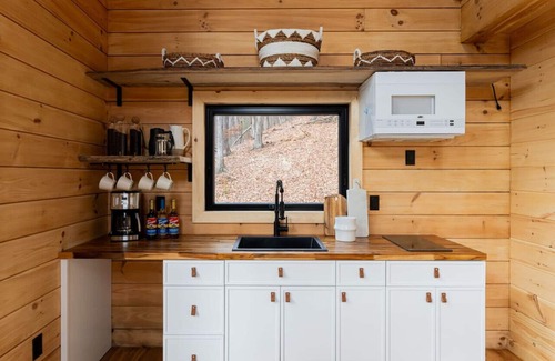 ESCAPE is what it's all about! Ascend the custom ladder to a cozy sleeping loft with premium, king-sized Brooklyn Bedding Aurora Luxe mattress sunken right into the hardwood floor. Right above you is a panoramic skylight, allowing you to sleep under the stars while wrapped up in 600 thread-count, ultra long-staple, 100% cotton sateen sheets.