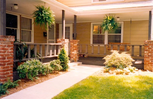 Front porch with swing, table and chairs. Small fenced back yard. Heavily treed lot.