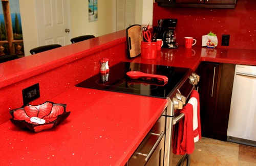 Modern with RED QUARTZ counter-tops in the galley kitchen •Fully equipped and stocked for gourmet meals •Counter seating •Dining area off the kitchen - round table w/ comfortable seating overlooking the pool