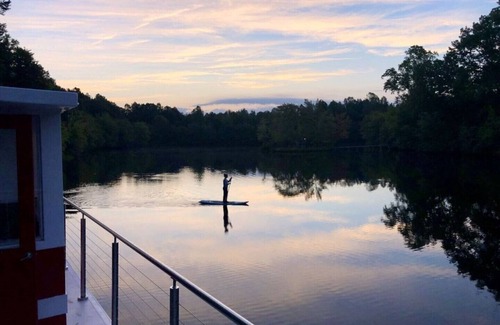 Get swept away to a Magical Tug/Houseboat! Renovated with all modern conveniences, including fully stocked kitchen, full bathroom, AC, heat, & WiFi. The Luxury Tugboat floats on an 8 acre private Lake with an Island on 142 Wooded Acres, with 5+miles of hiking trails. Enjoy Swimming, Kayaking, Stand Up Paddle boarding, Fishing, Hiking, Exploring, or just relax on your own beach by the fire pit. Only our family and our Log Cabin and Airstream Listings have access to the Lake and Property. We also have some farm animals...Sheep, ducks, chickens and rabbits that you can meet and feed.