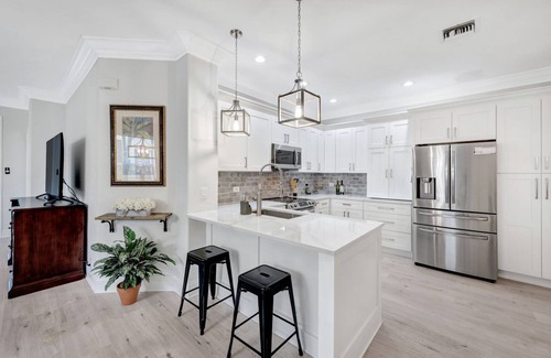 This private, two-bedroom, two-bathroom attached villa is the perfect Fort Myers retreat. Step inside to find stunning tile flooring, a modern kitchen with updated appliances, and a convenient coffee bar. Both the master and guest bedrooms feature comfortable queen beds. One of the highlights is the breathtaking lake view from your patio—perfect for morning coffee or a sunset cocktail.