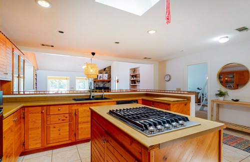 Climb up the stairs to reach the second level of the home and where you'll find the main living space with carpeted floors throughout. Offering a bright space to unwind, the living room has comfortable furniture and is a great spot to gather with your loved ones to plan your next adventures. You'll also notice a shelf with a plethora of fun, family-friendly board games for entertaining evenings at home. The fully-equipped kitchen will delight the chef of the group with its modern appliances, including a French-door fridge, stove, oven, dishwasher, microwave, endless counter space, and island. The adjoining dining table seats up to eight, perfect for family meals.