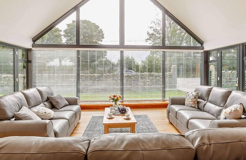 A combination of gloriously high ceilings, light flooding through huge windows and natural accents of timber and stone give this impeccably decorated holiday destination an ambience of comfort and style. Head to the spectacular kitchen/diner, where you’ll all want to gather while the food’s being prepared, swapping tales at the long table or relaxing in the comfy sofa. In summer you can throw open the patio doors, while in winter there’s the option of a large wood burner. Bifold doors connect this room to the triple-aspect lounge, another spacious room that’s full of light. Three of the five bedrooms are on the ground floor: two super-king-size (one can be twin on request) with en-suites, and a double with a Jack and Jill bathroom. There are two staircases, one of which accesses a double bedroom with an en-suite shower room, while the other leads to a king-size room with an en-suite shower and its own mezzanine snug/home office (overlooking the kitchen/diner). The garden includes a patio with a BBQ, a lawn, and an area with a hot tub.