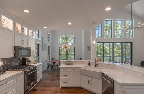 Entering the cottage, you will instantly enjoy the peace and tranquility not often found with waterfront living, allowing you and your guest’s complete privacy throughout your stay. Awe-inspiring architecture welcomes you as soon as you enter the home, creating a contemporary feel with open living spaces, soaring ceilings, a dream kitchen and panoramic views which can be enjoyed from nearly every room. The entry foyer opens to the fireside living room, seamlessly flowing into the expansive center island with breakfast bar, fully equipped kitchen, and separate dining area. The primary suite offers an en-suite bathroom with double vanity sinks and an oversized walk-in shower providing a relaxing, spa-like environment. Plus, a water filtration system is used throughout the entire home.