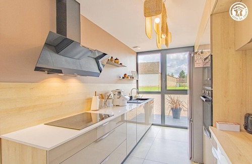 Lovely contemporary residence (built on the site of an old traditional barn), nestled in the quiet "backyard" on the edge of a mini pasture welcoming sheep in season, in the heart of a peaceful little typical & commercial village (including a mini-market). Total tranquility in the heart of unspoiled countryside, in the hollow of a plain of fields of crops & meadows dotted with bucolic rivers & fish ponds, close to several vast wild forests (to explore on foot or mountain bike), a stone's throw from the banks of the Doubs (paradise for kayakers & ultra-renowned fishing site for its famous catfish, pikeperch or carp) remarkable ecosystem partly classified as "Natura 2000 Zone" for its exceptional ornithological reserve rich in 160 species and its very rare plant varieties (various other natural areas protected in ZNIEFF to discover in the territory). Very comfortable gîte. Large living room (78m²). Spacious & bright. High quality equipment. Warm, contemporary country style, blending tradition and modernity in a peaceful, zen atmosphere. Plenty of charm. Cozy, cozy, and comfortable. A large terrace (exposed or shaded) opens onto a pleasant 1000m² garden, planted with lawns and trees (mirabell and fig trees, picking possible), and a pétanque court backing onto a covered terrace equipped with an outdoor lounge. Composition: Semi-detached house (completely independent). Fiber optic Wi-Fi. Heat pump heating. Air conditioning. Ground floor: living room-kitchen-lounge (wine cellar), 2 bedrooms (double bed 160x200cm in each), bathroom (shower), separate toilet. 1st floor: 4 bedrooms (double bed 160x200cm / double bed 160x200cm + extra double sofa bed 150x190cm / double bed 160x200cm / 3 single beds 90x200cm), 2 bathrooms (shower/wc). Land (1000m² / courtyard + garden) + terrace + sheltered terrace + pétanque court + bicycle storage + private parking. Mini-market 2 km. Supermarket 2 km. Amenities 3 km.