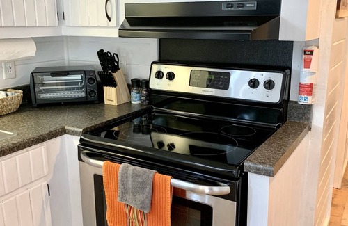 • Fully-equipped Stainless Kitchen with Full size Refrigerator, 5 Burner Oven, Toaster Oven, Microwave, Crock Pot, Coffee Maker, Blender, Dishes for 4, Baking Pans,