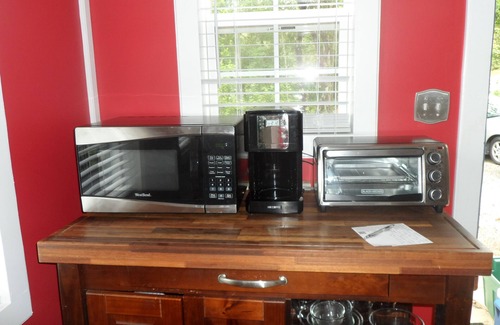 Interior features include hardwood floors throughout, a fully equipped country kitchen, dining area (seats 6), living area with reclining sofa & love seat, 52" HDTV, Wi-Fi Internet, and an assortment of books/games/movies. Hair dryers, iron, and ironing board are provided as are linens and towels....even utility towels for use with your pet in the event of rain!