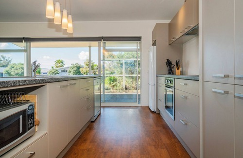 This bright and inviting Matarangi retreat offers a spacious open-plan living area, ideal for relaxation. Lounge around with a good book, catch up on your favourite shows, or simply enjoy the peaceful vibe of the space. The entertainer's kitchen, fully equipped for easy self-catering, keeps everyone in the conversation while meals are prepared.