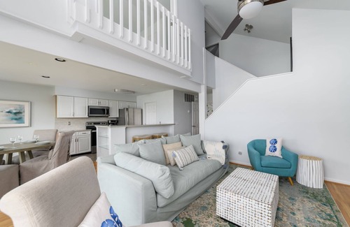 The first-floor great room is truly a sight to behold with its tall A-frame ceiling, beautiful wood flooring, and incredible natural light that illuminates the space. A cozy living area complete with plush seating in front of a fireplace and TV provides plenty of space to relax, unwind, and take in all the surrounding beauty. With gorgeous views through the sliding glass doors that lead out onto a quaint deck, guests can watch the golfers passing by under centuries-old live oaks draped in Spanish moss. Adjacent to the living area, there's a lovely dining space with seating for 4, offering expansive views out a large wall of windows. Any chef will love the open and airy kitchen, which has been thoughtfully updated with high-end stainless steel appliances. Plus, the spacious island provides ample counter space for meal preparation and entertaining. When it's time to retire for the night, there are 3 guest bedrooms to choose from—one with a queen bed and desk area and the other on the second floor with a queen-size bed.