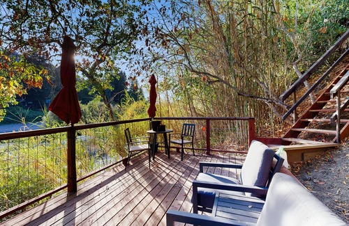 Nestled along the picturesque Russian River in Healdsburg, CA, this modern and updated home offers a unique retreat for upscale couples and wine enthusiasts. The property features two attached stacked units, with the main upper unit providing convenient street entry, while the lower unit is accessed by descending a short flight of stairs. Each unit boasts its own private patio, perfect for enjoying the serene river views and the gentle sounds of nature.