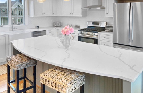 The upper main level offers a newly remodeled kitchen with an open living/dining area with views and sliders to a wrap around, expansive deck. The kitchen is fully equipped with new stainless steel appliances, bright white cabinets, and a center island with drawer-type microwave and stools for breakfast-bar seating. The kitchen now opens to the French-style dining area. The living room has updated, coastal furniture including a new couch. The sliders to the large back deck let the natural sun in and showcase the ocean views.