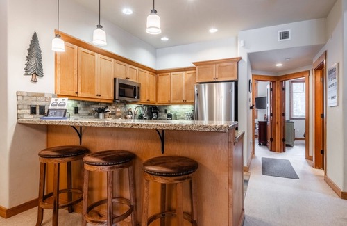 Step into the warmth of the spacious living area adorned with a cozy gas fireplace, LCD TV, and high-speed WIFI, ensuring relaxation after a day on the slopes. The well-appointed kitchen features modern appliances, and the convenience of a washer/dryer within the condo makes your stay effortless.