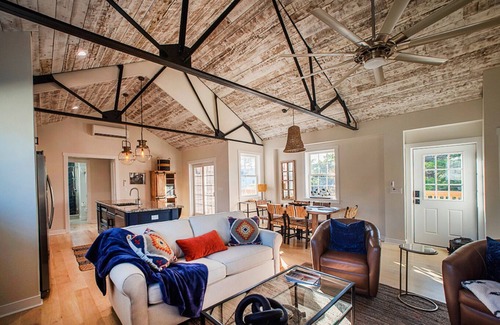 A stunning suite-newly constructed @ Preservation Forge-in the heart of downtown Lewes-named 2022's most beautiful city in America-a short walk to the beach, boutiques, restaurants, & cultural destinations of this charming town. With a fully stocked kitchen, spacious dining & lounging area, our cathedral great room is perfect for entertaining. Sleeps 4 w/ 1 King bedroom, 1 pull out Queen sofa bed, a full bath with tiled shower, & washer/dryer, just a few highlights of this 2nd story apartment.