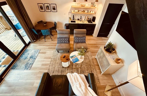 This modern cottage located on 6 sprawling acres is one of six located on Bluff Mountain across from the Trillium Wedding Venue. Nestled in the woods each cottage has a kitchenette, dining table with seating for four, love seat and two chairs. The large sliding glass doors at the front allow guests to immerse themselves in the relaxing woodland setting. The master bedroom features a king sized bed. Extra sleeping space is provided by two queen sized beds in the loft. The loft has a view through the large windows at the front of the cottage. A large shower and double sink vanity round out the amenities of the cottage. Our outdoor space features a deck with two adirondack chairs to enjoy your morning coffee while watching the beautiful morning sunrise. In the evening, you can enjoy our common area fire pit with a glass of wine while watching the lights of the city below.