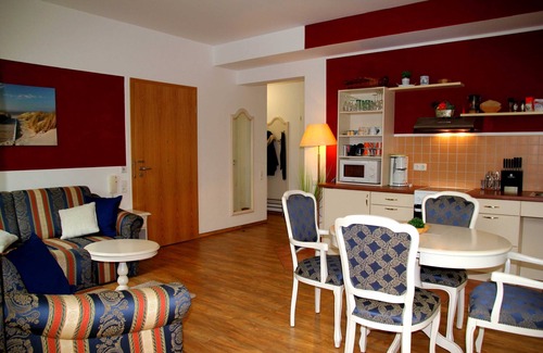 2-room apartment for up to 4 people + baby, wheelchair accessible with terrace, free Wi-Fi, kitchenette, washing machine, TV Flatscreen and free parking space, 150m to the beach. The bright and friendly 2-room apartment No. 1 "Ostseeglück" is located in the basement of Villa Wauzi and invites you to spend a cozy holiday for two or as a family on almost 60 square meters. The spacious living and kitchen area with adjoining terrace is high-quality and color coordinated so that nothing is missing. A very spacious bedroom with a box-spring double bed can accommodate 2 adults. In the living room, an additional 2 persons can be accommodated on a pull-out double sofa bed as well as an additional person in the pull-out armchair. An extra bed on request for a toddler up to 2 years in a travel cot is also possible.