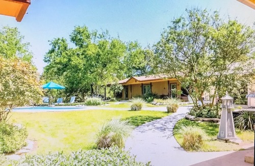 This is a 1200 sq ft private house! It is close to town but tucked away in a beautiful country setting. The setting is very tranquil with a balance of green lawn and trees all around. It sits on a private 5 acres. Only 10 minutes away is easy access to town, the University and the river. It is completely fenced in and has a private driveway with a large parking area. Another amenity is the large and sparking clean in ground pool. The pool is not shared. There are lots of outside sitting areas to enjoy the pool and beautiful landscaping. The house has awesome large rooms and large bathrooms with double vanities. It has a king bed, queen bed, 1 floor mattress, 2 love seats, a dining room and living room.